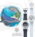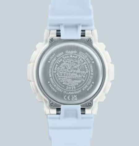 2025年は丸い頭と愛らしい表情が魅力の「スナメリ」をデザインモチーフに採用。体色をイメージしたホワイトをメインカラーに、スナメリが生息する近海をバンドのライトブルーで表現しました。さらに、6時位置のインダイアルリングを「バブルリング」に見立て、鮮やかなブルーを配色。メタル遊環には元気に泳ぐ姿をシルエットで刻印しています。