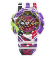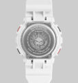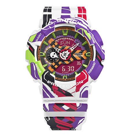 G-SHOCK全体にエヴァンゲリオン初号機が描かれ、12時側のバンドには初号機の頭部装備である角、ベゼル部分には初号機の顔、ベゼル下部から6時側のバンドにかけてはロンギヌスの槍を投擲しようとする左腕がデザインされています。