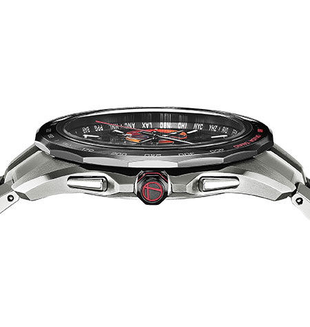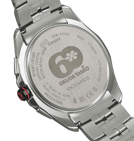 サファイアガラスベゼルのタキメーターには「OKUDA TAMIO」の文字と生誕60周年を祝い「60」の文字を赤色にした特別仕様。