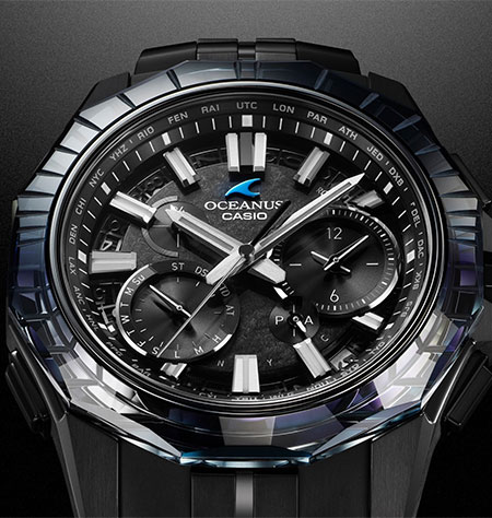 透明感のなかに深みと輝きを生み出す色調は、ブラックとシルバーのグラデーション蒸着によるもの。どこまでも続くような広大な海を表現し、見る角度によってブルーに偏光することで、オシアナスらしい表情を醸し出します。