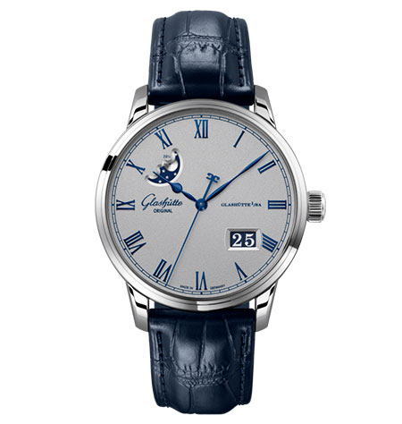 ポリッシュ/サテン仕上げのケースは光沢が美しく、細かい溝が刻まれたリューズにはグラスヒュッテ・オリジナルを象徴するダブルGのロゴがあしらわれています。