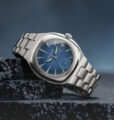 ミドルケースとベゼルとでそれぞれの面に異なる仕上げを施しているのでコントラストを際立たせながら、さらに同じチタン製ブレスレットもポリッシュ仕上げとサテン仕上げを組み合わせており、部品同士が調和を生み出しています。