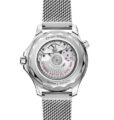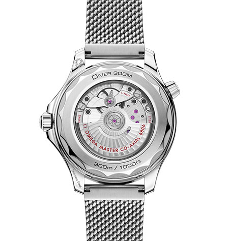 合わせられているのは、クラスプが付いたメッシュブレスレットです。オメガ コーアクシャル マスター クロノメーター キャリバー 8806搭載。サファイアクリスタルガラスのケースバックからその姿を眺めることができます。