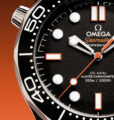 同じくブラックアルミニウム製のダイアルには、ロジウム仕上げの、ホワイトスーパールミノヴァが塗布されたスケルトン針およびインデックスが配されています。中央の秒針、15分毎のインデックス、そして「Seamaster」の名はオレンジで彩られ、オメガのロゴはホワイトの転写で施されています。