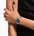 サンブラッシュ仕上げ、PVDコーティングとラッカー仕上げを施したブルーのダイアルは、6時位置に丸型の日付窓を備えます。ヨットの船体を象った11個のインデックスと面取りを施し新たにデザインされた針が配され、分針は先に行くにつれ細くなる繊細な形状に仕上げられています。アプライドのディテールと針はすべて18Kホワイトゴールド製で、インデックスと針には、ブルーの光を放つホワイトのスーパールミノヴァが塗布されています。