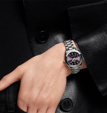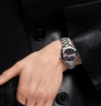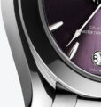 サンブラッシュ仕上げを施し、色のついたラッカーで彩られたラベンダーカラーのダイアルは、6時位置に丸型の日付窓を備えます。ヨットの船体を象った11個のインデックスと面取りを施し新たにデザインされた針が配され、分針は先に行くにつれ細くなる繊細な形状に仕上げられています。アプライドのディテールと針はすべて18Kホワイトゴールド製で、インデックスと針には、ブルーの光を放つホワイトのスーパールミノヴァが塗布されています。