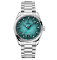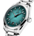 ラッカー仕上げのターコイズダイアルにはブラックのグラデーションがデザインされ、面取りされた針とインデックスはグレーのPVD加工とホワイトのスーパールミノヴァで仕上げられています。 同じくグレーのPVD加工が施されたオメガのロゴと日付窓が、グレーとターコイズの転写文字とハーモニーを奏でています。
