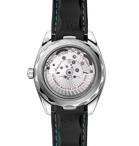ターコイズのステッチがあしらわれたフォールディングクラスプ付き一体型ブラックラバーストラップが合わせられ、着け心地のよさを約束します。スイス連邦計量・認定局(METAS)認定の業界最高水準を誇るオメガ コーアクシャルマスター クロノメーター キャリバー8900搭載。