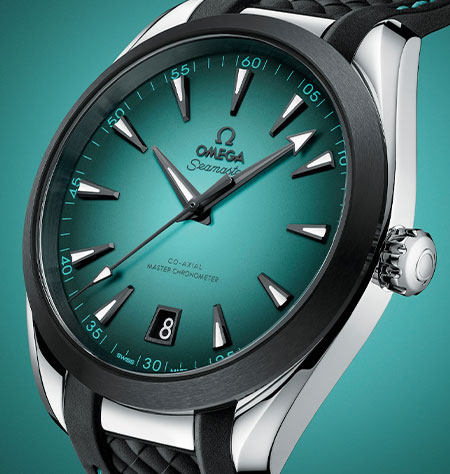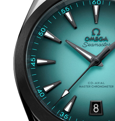 海をインスピレーションにした魅惑的な色彩を奏でるラッカー仕上げのターコイズダイアルには、ブラックのグラデーションが施され、面取りされた針とインデックスはグレーのPVD加工とホワイトのスーパールミノヴァで仕上げられています。同じくグレーのPVD加工が施されたオメガのロゴと日付窓がグレーの転写文字とマッチし、外周のターコイズカラーのミニッツトラックとハーモニーを奏でています。
