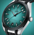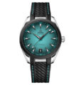 ターコイズのステッチがあしらわれたフォールディングクラスプ付き一体型ブラックラバーストラップが合わせられ、着け心地のよさを約束します。スイス連邦計量・認定局(METAS)認定の業界最高水準を誇るオメガ コーアクシャルマスター クロノメーター キャリバー8900搭載。