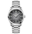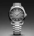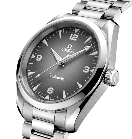 ブラッシュ&ポリッシュ仕上げを施した左右対称の38mmのケースには、簡単に調整できるコンフォートシステムを備えた、同様にブラッシュ&ポリッシュ仕上げのリンクが形作る一体型ブレスレットが合わせられています。初代「レイルマスター」の読み取りやすい表示を活かしたこのモデルのダイアルは、ブラックのグラデーションがかかったグレーカラー。大きな数字とインデックスにはホワイトのスーパールミノヴァが塗布されています。