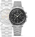 ポリッシュ仕上げとブラッシュ仕上げのアーチ型リンク5つで一列を構成するブレスレットが付属する、この42 mmのステンレススティール製ムーンウォッチは、フロントとケースバックにサファイアクリスタルガラスが採用されています。月面で着用された第4世代のスピードマスターのデザインからインスピレーションを得たこのモデルも、非対称ケース、オメガのアプライドロゴ付きの段差を設けたブラックダイアル、陽極酸化処理を施したアルミニウム製ベゼルリングに配された有名な「ドットオーバー90」(90の数字の上にドット)を採用しています。