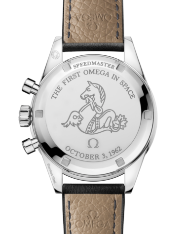 ダイアルとリュウズにはヴィンテージのオメガ ロゴがあしらわれ、ケースバックには有名なシーホースのメダリオン、そして“THE FIRST OMEGA IN SPACE”、“OCTOBER 3, 1962”の文字のエングレービングが施されています。