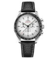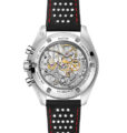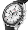 この42mmのステンレススティール製ムーンウォッチには、レッドとホワイトのステッチが施されたブラックのパンチングレザーストラップが付属。フロントとケースバックにはサファイアクリスタルガラスが採用されています。月面で着用された第4世代のスピードマスターのデザインからインスピレーションを得たこのモデルは非対称ケースを備え、ホワイトラッカー仕上げ段差を設けたステップダイアルには、アプライドのオメガロゴとインデックス、ムーンウォッチスタイルの針が配されています。そして、陽極酸化処理を施したアルミニウム製ベゼルリングに有名な「ドットオーバー90」(90の数字の上にドット)があしらわれています。