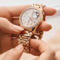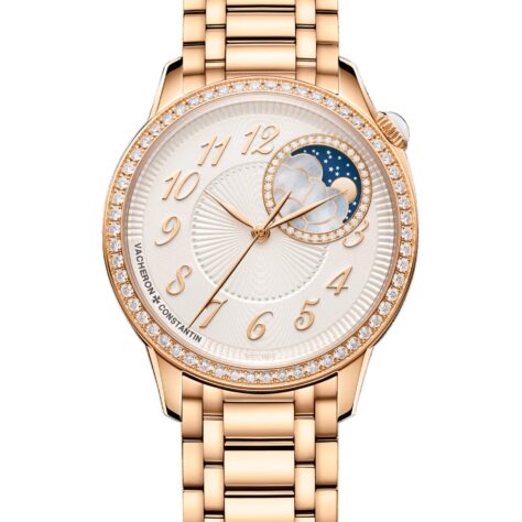 58個のラウンドカット・ダイヤモンドとカボションカットのムーンストーンがセットされたこの18K 5Nピンクゴールド製の時計には、第二の肌のような着け心地のピンクゴールド・ブレスレットが取り付けられています。