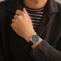曜日と月名を窓で表示する一方で、日付を細いセンター針で表示させ、文字盤の外周に配置するという異例のレイアウトによって、6時位置の高精度なムーンフェイズを強調しています。