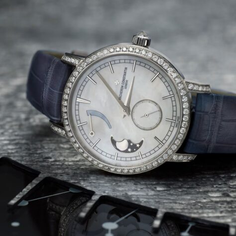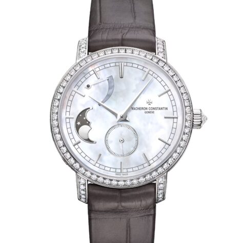 この18Kホワイトゴールドの時計には、81個のラウンドカット・ダイヤモンドがセットされており、高精度のムーンフェイズが付属しています。