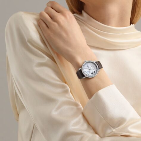 マザーオブパール文字盤の中央にセットされたムーンフェイズには、星がきらめく夜空が取り付けられており、そのカラーはアリゲーター ストラップにもさりげなく取り入れられています。
