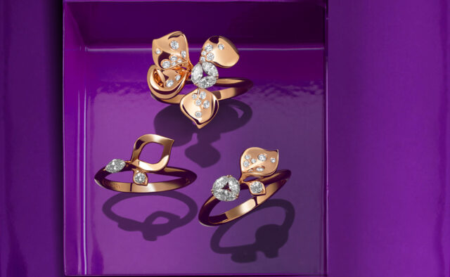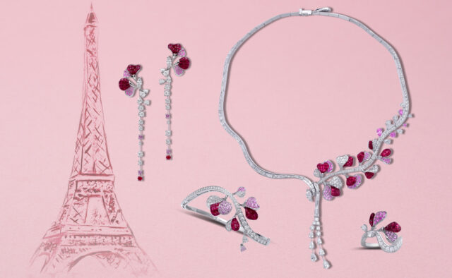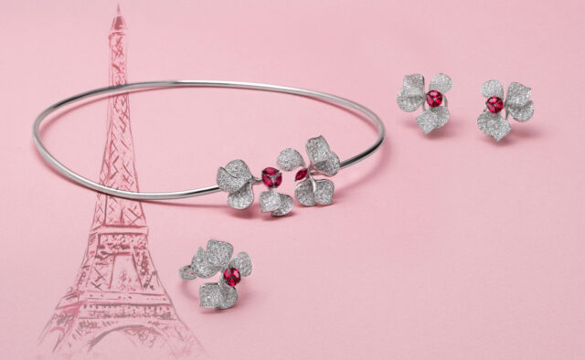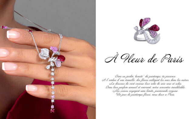 大小様々な形をした葉や花びらを絶妙な角度でセットしたデザインが、煌めくダイヤモンドやルビー、ピンクサファイアの輝きを最大限に引き立てるコレクションです。