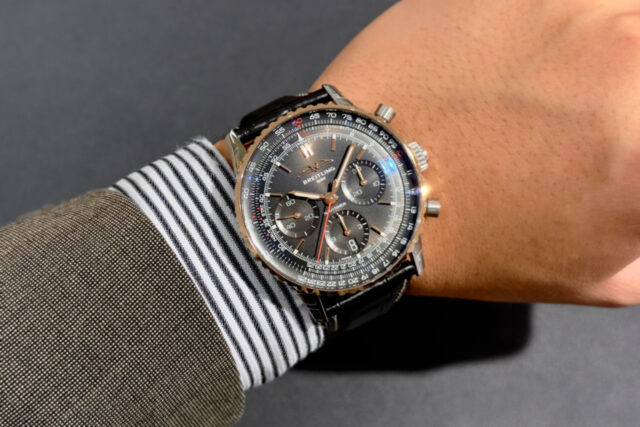また、今作はベゼル以外、ケースからラグにかけてステンレスのみで構成されているので、後ほどステンレスのナビタイマーブレスレットに付け替えても違和感なく、よりスポーティなスタイルでお楽しみいただけます。