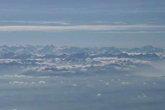 (↑ストックホルムからジュネーブへ向かうスイスエアの機内から見えるアルプス山脈。)
